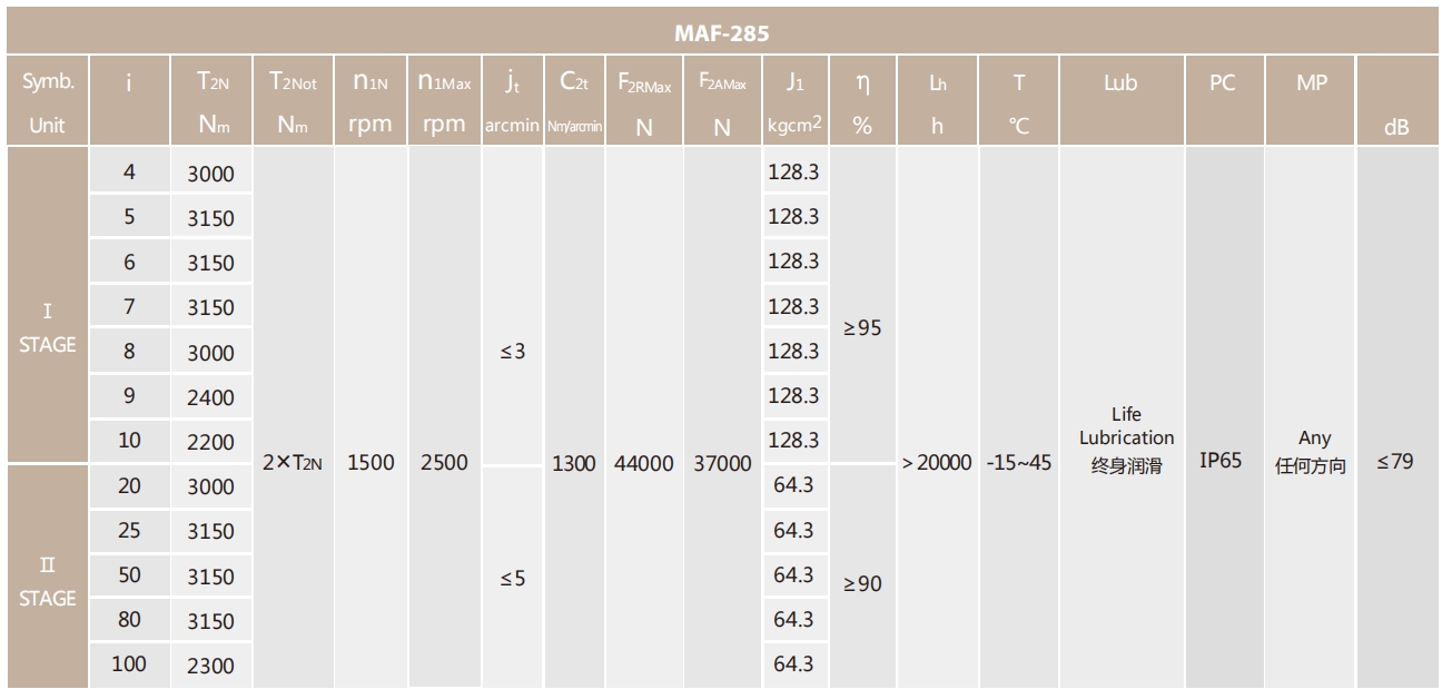 MAF-285-L1系列超精密背隙行星減速機系列(P0): MAF-285-L1系列精密背隙行星減速器系列(P1): MAF-285-L1系列標(biāo)準(zhǔn)背隙行星減速機系列(P2):